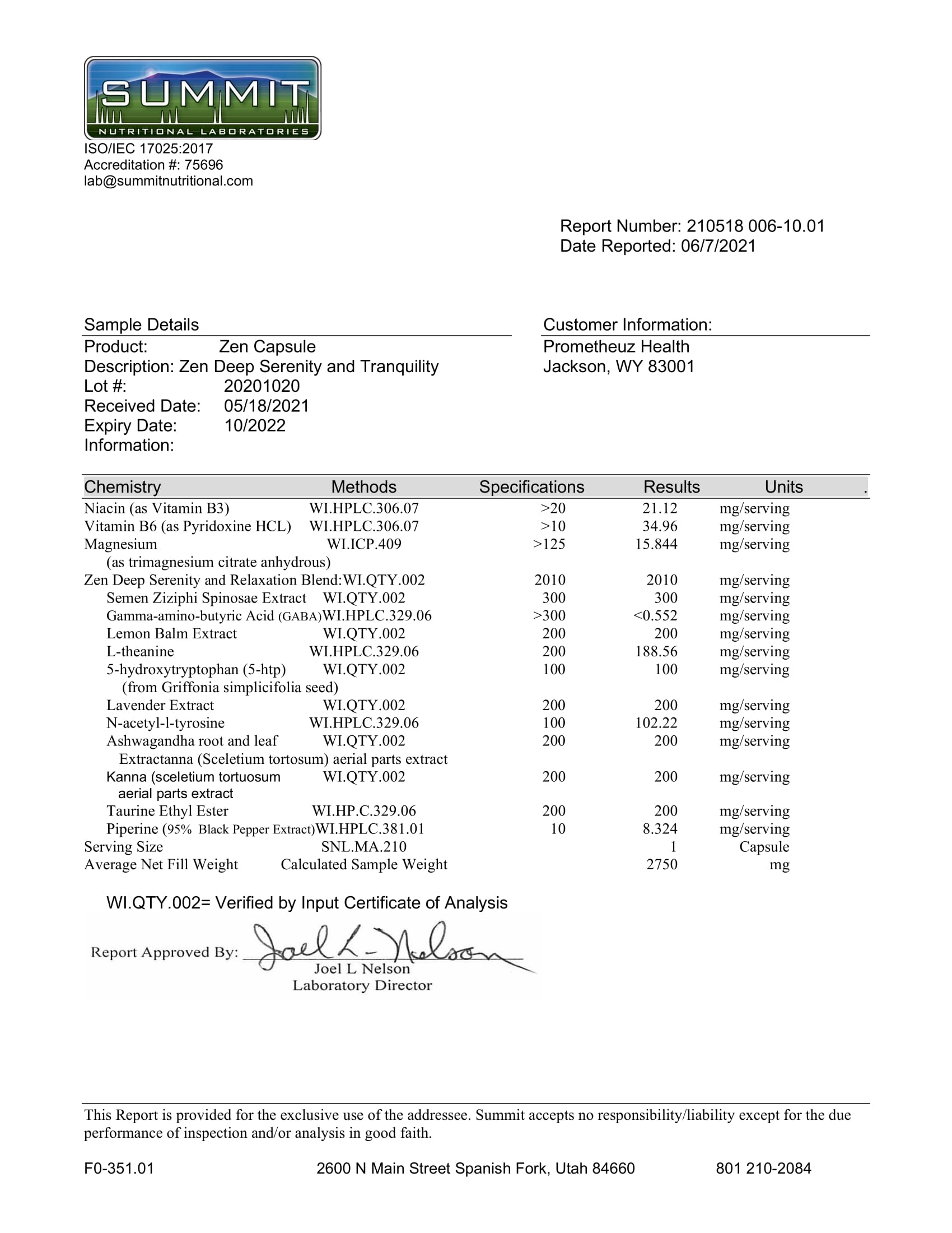 Semen Ziziphi Spinosae extract 300mg, Gamma-amino-butyric Acid (GABA) 300mg, Lemon Balm Extract 200mg, L-theanine 200mg, 5-hydroxytryptophan (5-htp)(from Griffonia simplicifolia seed) 100mg, Lavender Extract 200mg, N-acetyl-l-tyrosine 100mg, Ashwagandha root and leaf extracttanna (Sceletium tortuosum) aerial parts extract 200mg, kanna (sceletium tortuosum) aerial partsextract 200mg, Taurine Ethyl Ester 200mg, Piperine (95% Black Pepper Extract) 10mg