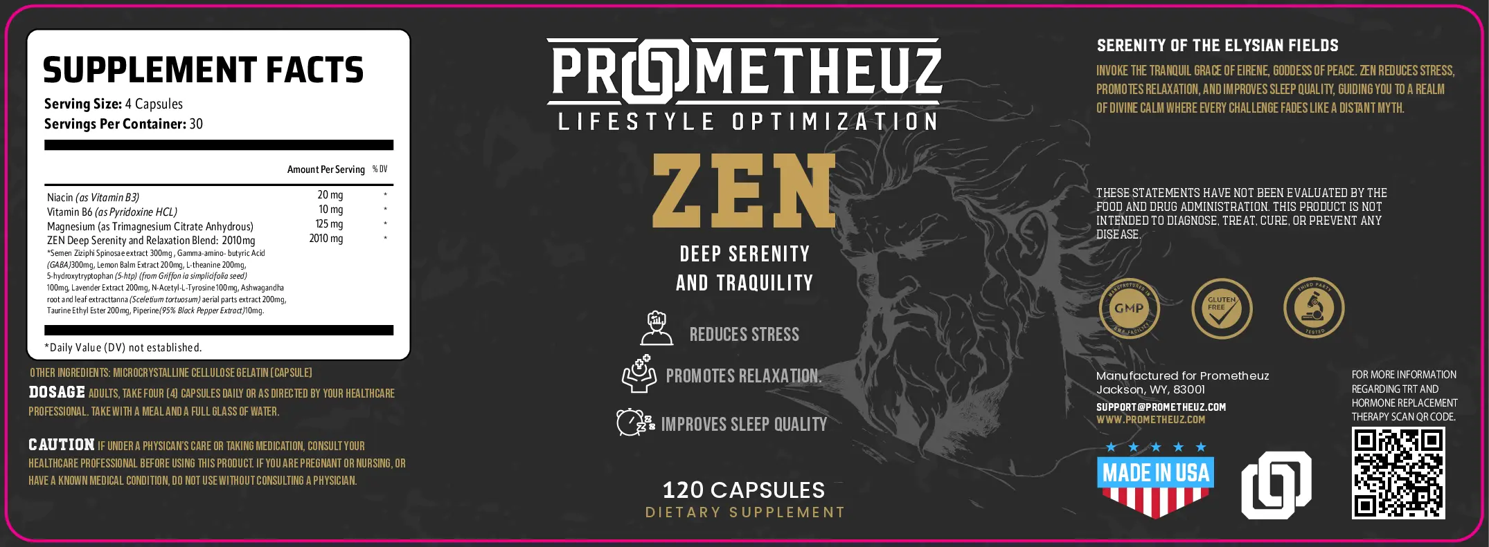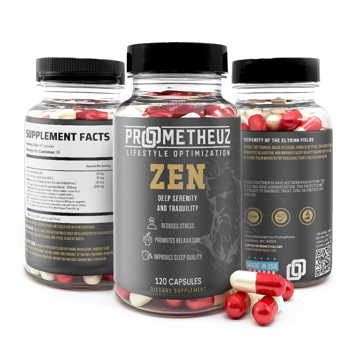 Prometheuz Healths Zen Deep Serenity and Tranquility Capsules are a serenity supplement designed to promote mood regulation and enhance relaxation for a serene sleep experience. Enriched with serenity vitamins and minerals, this nightly nootropic contains natural ingredients sourced from amino, herbs, plants, and food extracts, all in easy-to-use serenity pills.